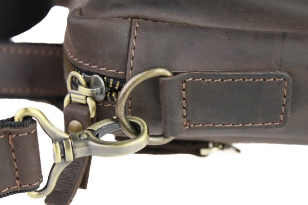 Горизонтальна шкіряна чоловіча сумка для документів формату А4, виготовлена вручну з використанням натуральної шкіри. У сумці є одне велике відділення, яке закривається на блискавку, з перегородкою і кишенею для мобільного телефону. Ззаду сумки розташований відділ, також забезпечений блискавкою. Сумка легко вміщує папку формату А4. Ручки сумки виготовлені зі шкіри, а плечовий ремінь, який можна регулювати, також обшитий шкірою. В сумці також присутні шкіряні перегородки.