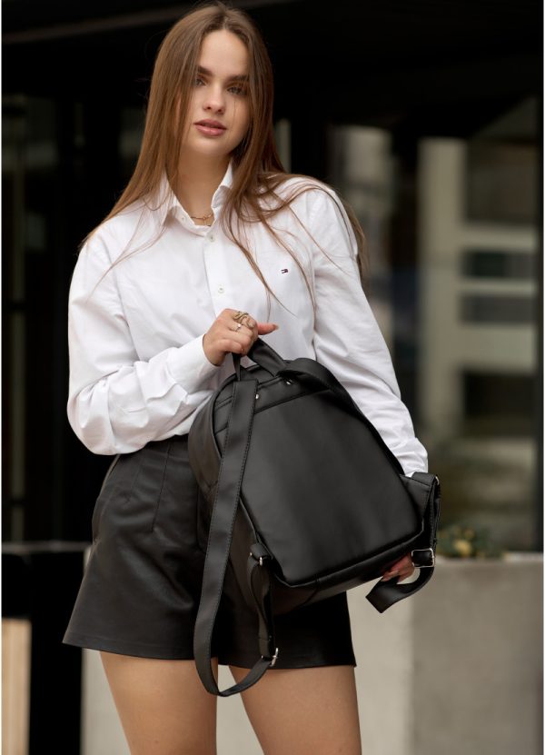 Дизайн: Чорний колір рюкзака надає йому універсальності, а стильний силует підкреслює жіночність. Лаконічні лінії та відсутність зайвих деталей роблять його ідеальним вибором для будь-якого випадку. Рюкзак легко поєднується з різними стилями одягу, від класичних до кежуал.